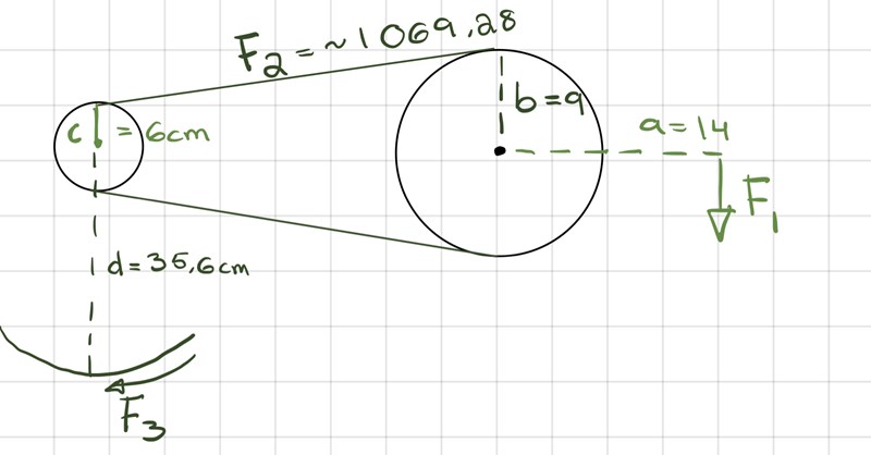 F3*d = F2 * c -> F3 = ~25 N <- kraften som ska driva cykeln framåt