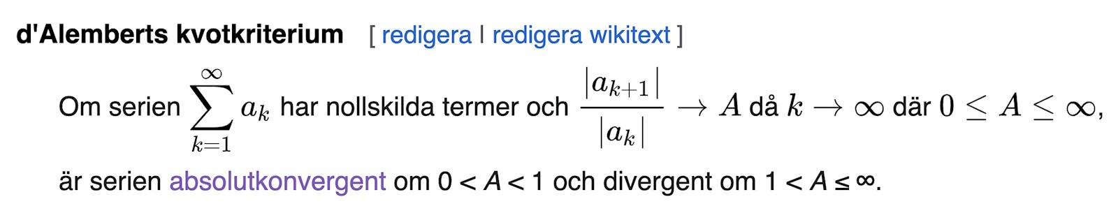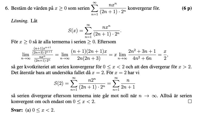 Jag har stött på en uppgift där jag behöver bestämma för vilka värden på x som är större än eller lika med 0 serien ∑ från n=1 till oändligheten av (n*x^n)/(2n+1)*2^n konvergerar, och jag måste erkänna att jag är lite förvirrad. Uppgiften (och lösningen) lyder så här: