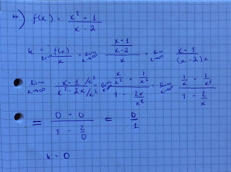 Grafen kommer ju gå mot en asymptot med utseendet y=kx+m, men då kan ju inte k=0? Var gör jag fel?