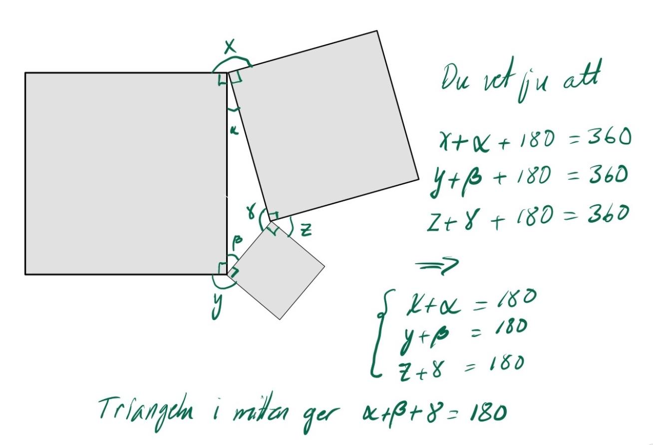 - Är du med på att det hela varvet runt punkt A kan delas upp i de fyra vinklarna 90° (den röta vinkeln till höger), x (vinkeln uppåt), 90° (den räta vinkeln åt vänster) och u (vinkeln neråt, "in" i triageln)?