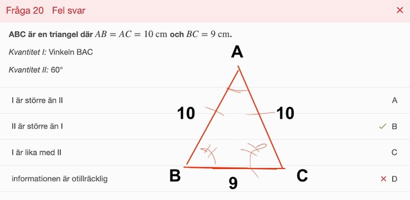 På den här uppgiften så tror jag att jag har hittat triangeln rätt. Vi vet att den är likbent, så den har två lika stora basvinklar, basvinkeln ABC och CAB. Vinkeln BAC måste därav vara mindre än de likbenta basvinklarna, eftersom avståndet mellan BC är mindre än den för AB och AC. Har jag resonerat rätt? Är triangeln ritad rätt?