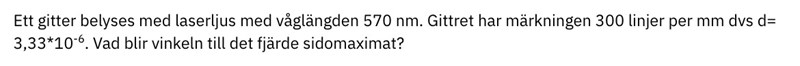 Vi vet också att glitterkonstanten är . Men jag fattar inte hur man ska göra sen för att lösa uppgiften, eller vad ”fjärde sidomaxima” betyder.