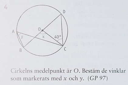 Jag har problem med att bestämma vinklarna x och y inuti denna cirkel.