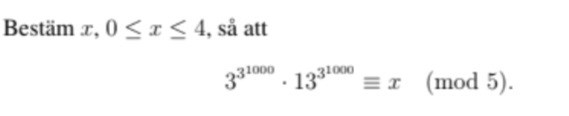 Sen tänkte jag att exponenten 31000 kommer att bli ett udda tal vilket gör att det blir kongruent med -1 och om det ska vara inom intervallet blir x = -1 + 5 = 4.