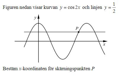 När jag däremot kontrollerar detta i Geogebra verkar inte x2= pi/3 vara x-koordinaten då cos(2*pi/3)=-1/2. istället är x-koordinaten i punkten P ungefär lika med 2.617 vilket jag inte förstår då jag inte fick det som en lösning.