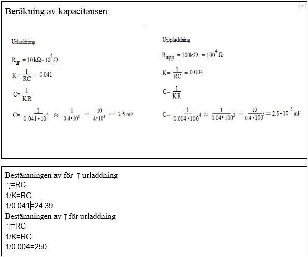 Räknar sedan ut C för uppladdningen och byter ut R=10 ohm till R=100 ohm och får en helt annan kapacitet.