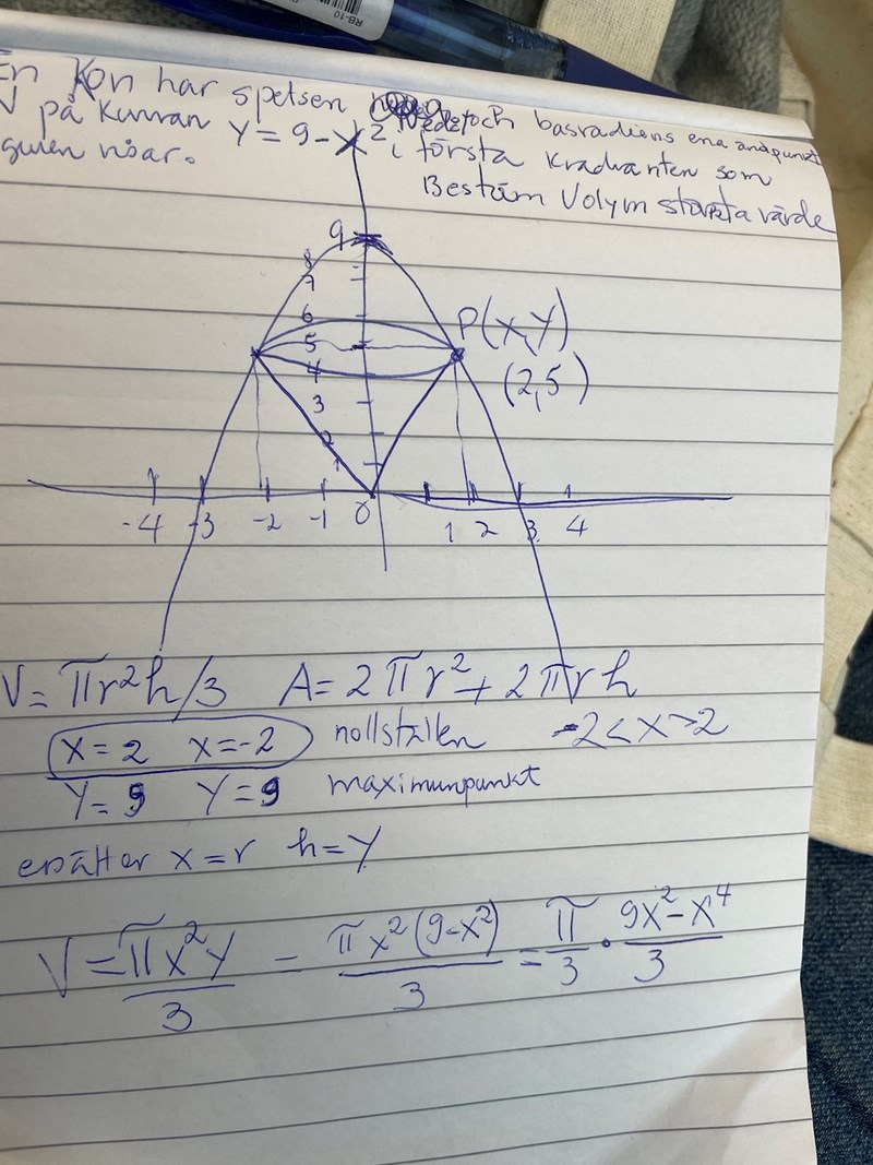 men varför bryr du dig om det?, uppgiften är väl att hitta största möjliga volym hos konen under villkoret att basytans periferi tangerar kurvan y = 9-x2 ? !