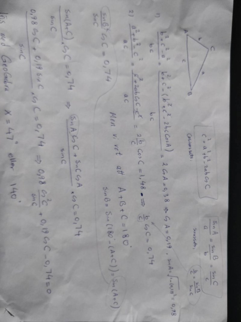 Jag gjorde så: b^2+c^2-a^2=0,38bc. a^2+b^2-c^2=1,48ac. (b^2+c^2-a^2)/0,38b=c. (a^2+b^2-c^2)/1,48a=c.