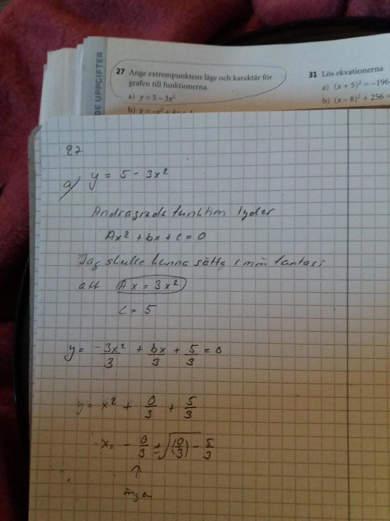 Det kanske blev lite rörigt men fråga om eventuella frågetecken skulle dyka upp. Ett tips är att repetera pq-formeln lite så hänger du med, i övrigt ser dina beräkningar fina ut. Lycka till!