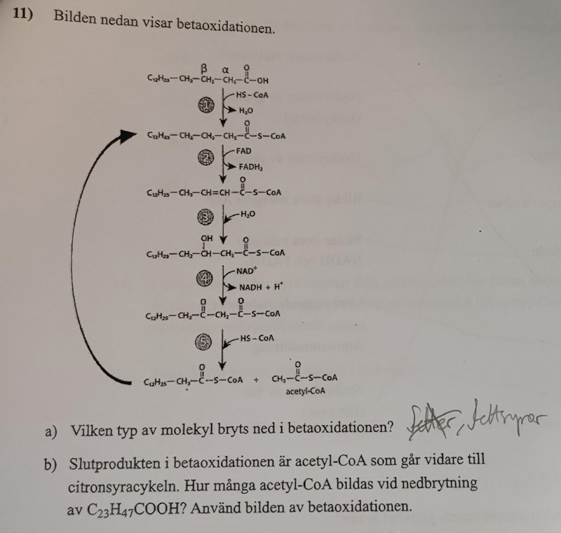 Jag tänkte ju att man skulle kolla på antalet kol som kommer in i betaoxidationen och antalet som kom ut ur betaoxidationen men det gick inte så bra att förstå hur man skulle lösa uppgiften.