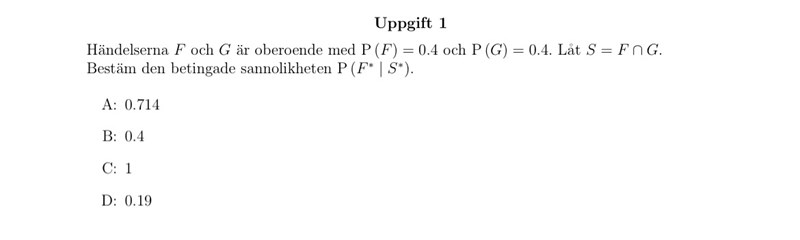 p(F* snitt S*). Jag tolkar detta uttryck som området som är utanför F och samtidigt exkluderar F snitt G, vilket kvar blir området av G minus snittet av F och G. Men då får jag fel svar. Enligt facket är alternativ A: 0,714 korrekt.