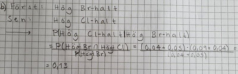Din täljare är fel. Du finner sannolikheten att både klorhalten och bromhalten är hög i tabellen.