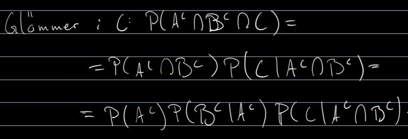 Undrar dock fortfarande över lite teori till uppgiften: Tänker att A är oberoende av B och C, eftersom den sker först. B är beroende av A men oberoende av C, och C är beroende av både A och B.