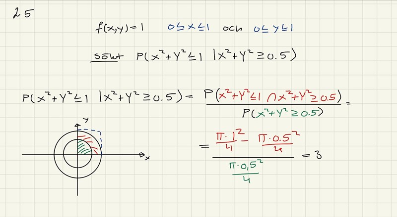 Jag är lite osäker på din skiss. Den gröna termen är sannolikheten att x^2+y^2 är STÖRRE än 0.5, så för mig borde det vara inom kvadraten men utanför det som du nu ritat som grönt (dvs komplementet till det du ritat/skrivit nu).