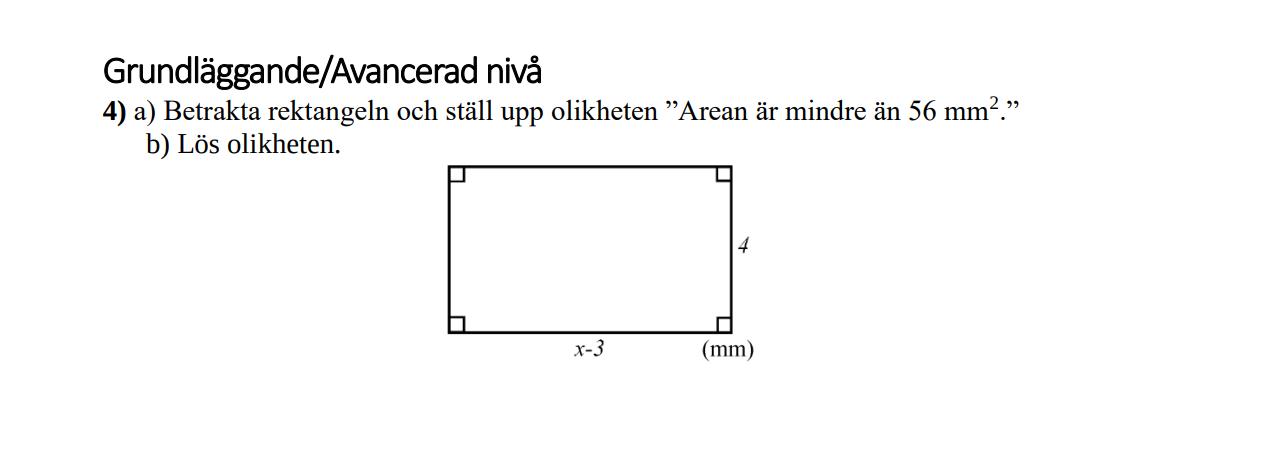 Smaragdalena skrev:Läs uppgiften! Hur stor area har rektangeln? Kan du skapa en lämplig ekvation och lösa den?