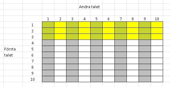 "Första talet mindre än 4" är gulmarkerat. "Andra talet udda" är gråmarkerat.