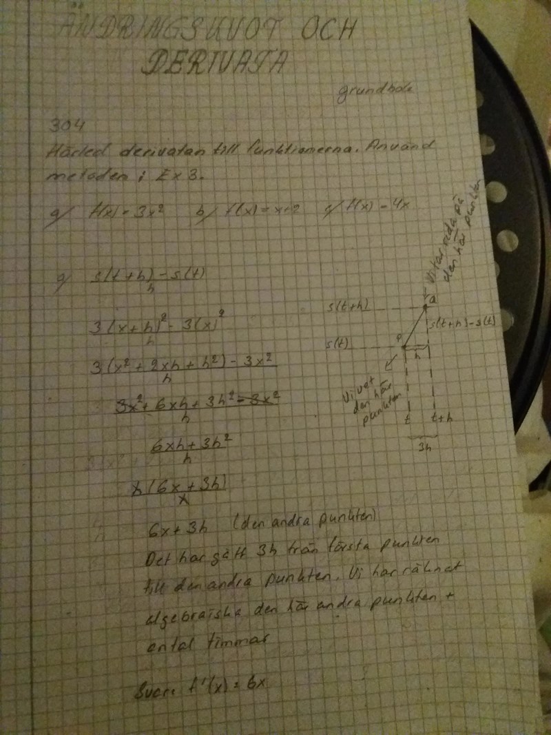 Okej, men för att utvidga lite vad man menar är att du har en sekant mellan de två punkterna. Man har då räknat fram att lutningskoefficienten är 6x + 3h för sekanten, och här är h bara en variabel som säger hur långt det är från ena punkten till den andra.