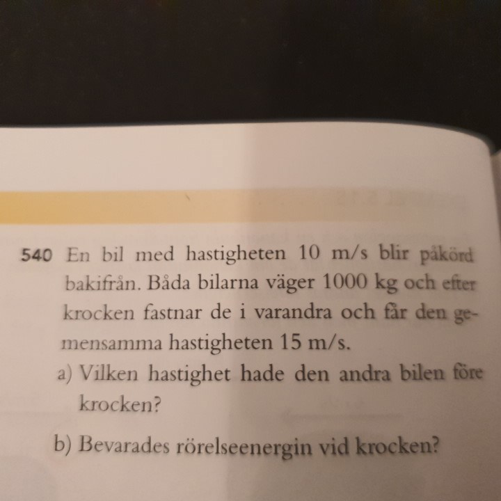 Sedan har du rätt att båda bilarna har hastigheten 15 m/s efter kollisionen. Så du kan enkelt beräkna totala rörelseenergin före respektive efter kollisionen. Är de lika så är rörelseenergin bevarad, annars inte.