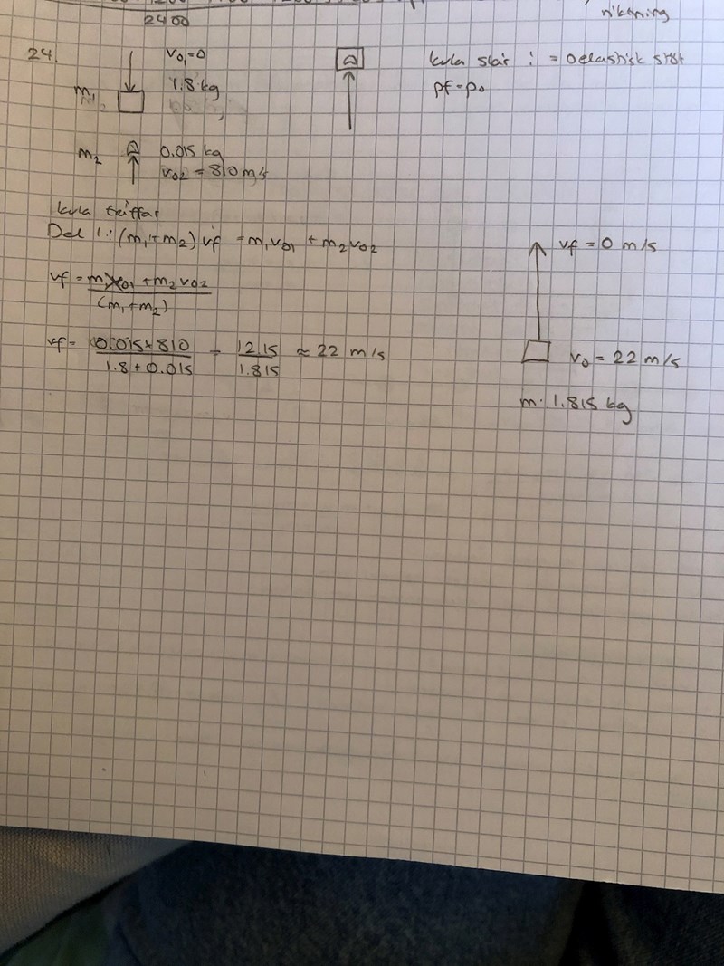 Vi får i uppgiften reda på att blocket har fallit från stilla till dess att den träffas av kulan, dessutom får vi reda på att blocket når precis lika högt efter träffen som det var från början.
