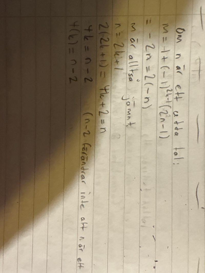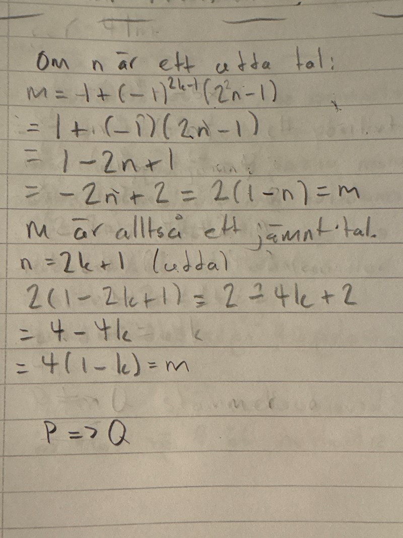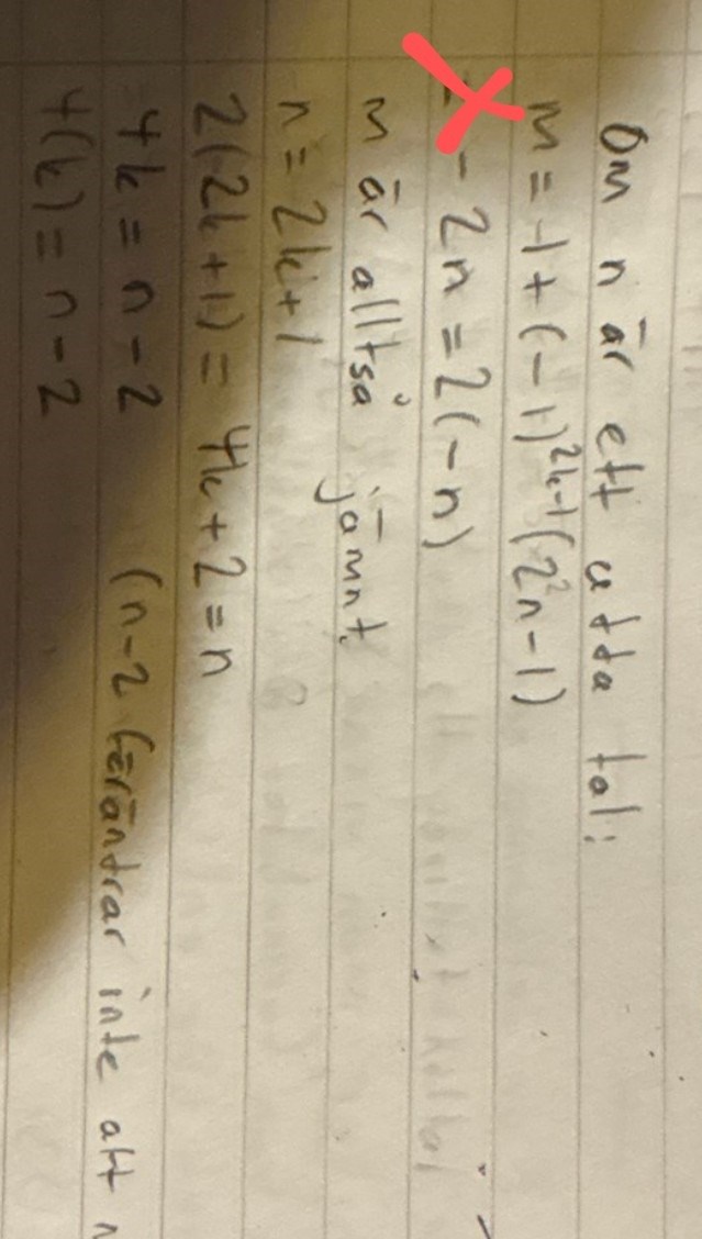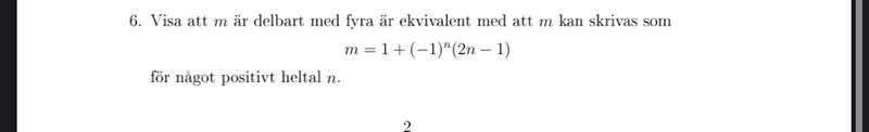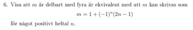 m=1+(-1)n(2n-1)=[n är jämnt och positivt]=1+2n-1=[här skriver du om uttrycket så att det blir tydligt att det är jämnt delbart med 4]=...