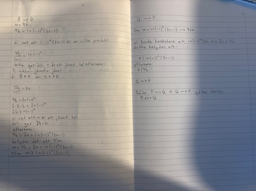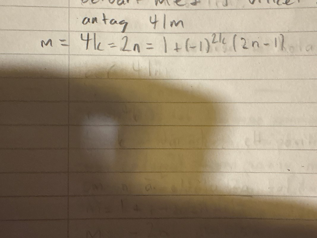 Försökte också resonera på detta vis, då kan man säga att vartannat jämnt tal är delbart med fyra, vilket är vad din aritmetiska talföljd med differensen 4 visar. Då gäller det att visa hur m=1+(-1)^n(2n-1) är en del av denna aritmetiska talföljd…. (vilket du redan gjort)