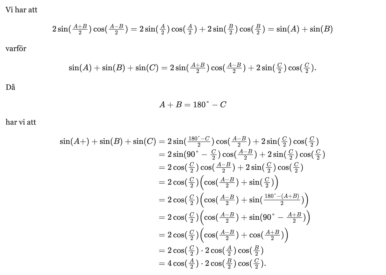 Jag ska visa att Sin A + Sin B + Sin C = 4 Cos A/ 2 x Cos B/2 x Cos C/2.