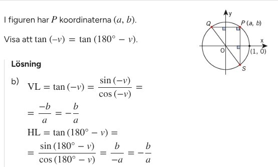 Hej! Jag gjorde detsamma som facit i VL och HL, däremot fastnade jag på sista steget i HL där det sista blev b/-a. Hur vet jag just vilket x och y-värde jag ska läsa av enhetscirkeln (för att veta om a och b blir negativa/positiva)? Det står 180-v, men vi vet inte hur stor v är för att avgöra vilken kvadrant vi hamnar i om ni förstår vad jag menar. Tacksam för lite hjälp!