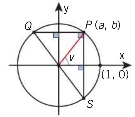 Vinkeln v motsvarar punkten P och ligger alltså i första kvadranten. (Vinkeln -v motsvarar punkten S och vinkeln 180°-v motsvarar punkten Q)