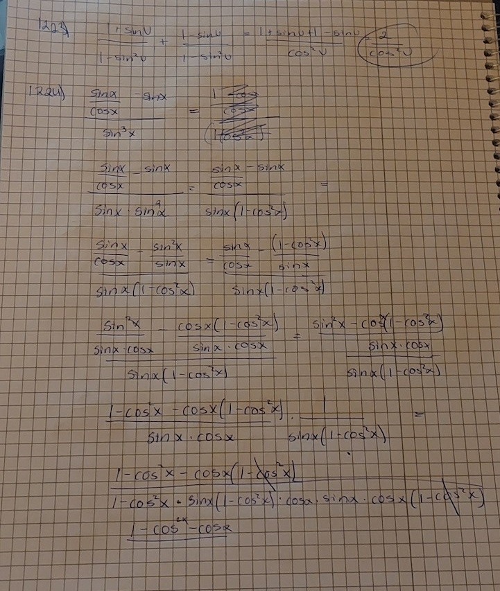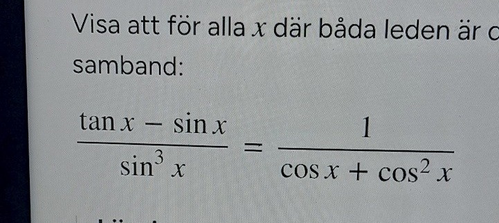 Som du ser, gör om tanx så vi har något att arbeta med. Gör om sinx kubik till något lättare, helst något i termer av cosx.. trig ettan. Förenkla lite och därefter konjugatregeln.