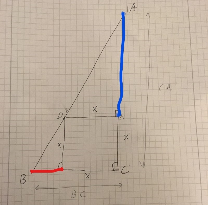 Vi vet ju att de tre trianglarna är likformiga men hur ska jag tänka här?