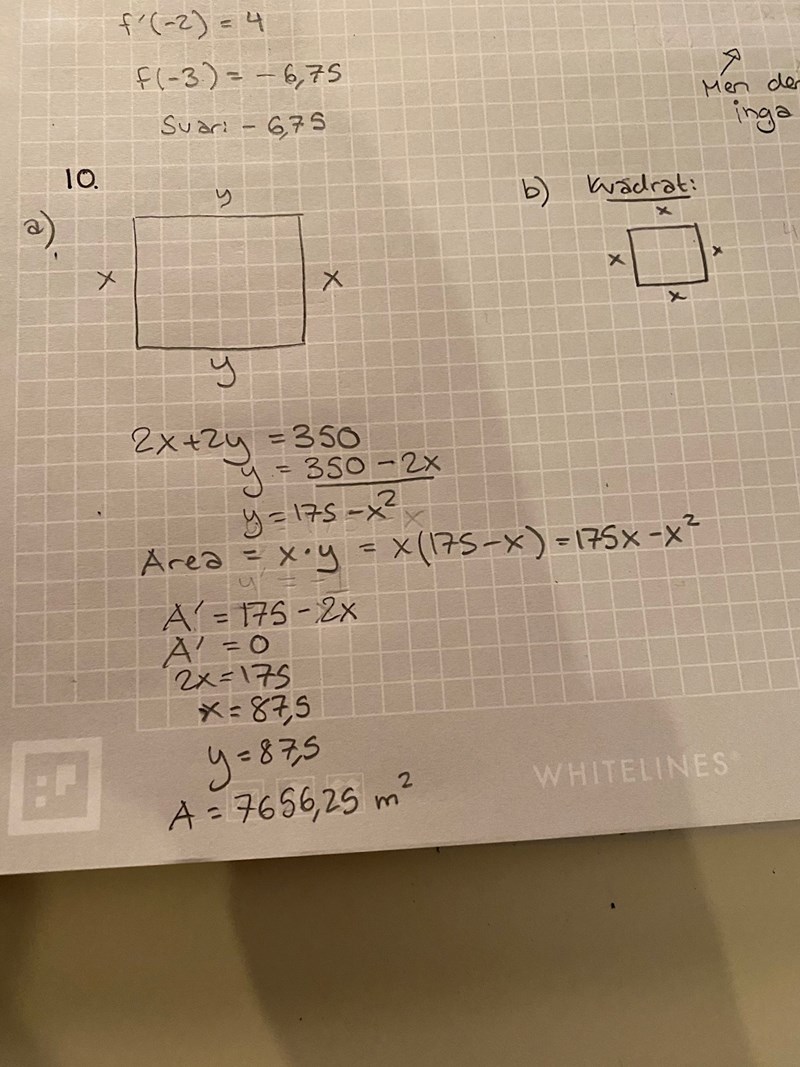 Det är inte A' som är xy = 0,5Lx-x2, det är A. Vad är A' och A = 0,5Lx-x2? Sätt derivatan lika med 0 och lös ut x.