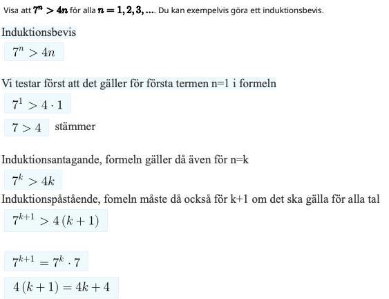 Högst upp på bilden är beviset jag borde lösa. Jag har gjort induktionsantagandet och induktionspåståendet, men jag vet inte hur jag skall fortsätta så att det blir bevisat. Vet någon hur man kommer till en lösning?