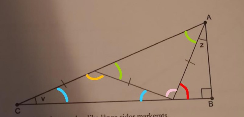 Jag började med att kalla den gula vinkeln 180-2v, efter det så kallade jag de gröna vinklarna för 180-(180-2v), som blir 2v. Sedan så kallade jag den rosa för 180-4v eftersom de gröna är 2v var, den röda kallade jag 180-(v+(180-4v)) som blev 3v. Resten var simpelt, eftersom den röda var 3v så måste z vara 180-(90+3v) som blir 90-3v.