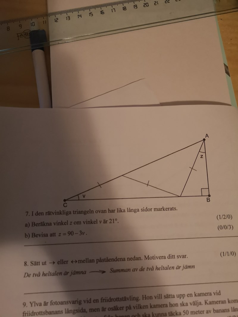 Jag vet att två av vinklarna i likbenta trianglar alltid är lika stora. Men jag förståe inte hur det ska hjälpa mig för att bevisa att Z=90-3v....