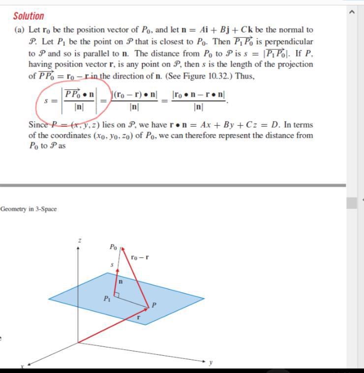 hej jag håller på att läsa i min mattebok om avstånd mellan punkt och plan. Jag förstår allt i deras förklaring up till det jag ringat in i rött. varför har dom valt att ha || över hela? jag trodde skalärprojektionen va a*b/|b| och inte |a*b/|b||