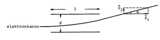 Elektroner åker genom accelerationsspänningen U1 i en elektronkanon och får då hastigheten v1. Sedan kommer elektronerna in i avståndet mellan två metallplattor som har längden l och avståndet mellan plattorna d. Om spänningen U2 finns mellan plattorna får elektronerna, när de passerar, ett hastighetstillskott v2, vinkelrätt mot v1. Då avlänkas elektronstrålen med vinkeln α, och då gäller följande: tan α=v2v1