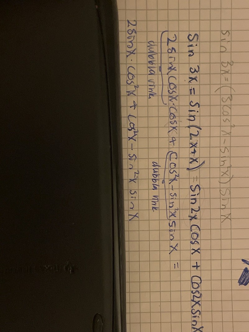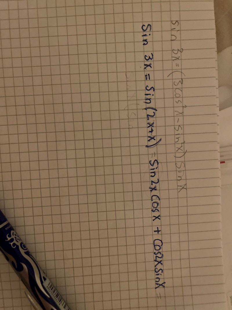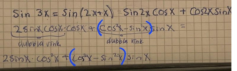 Skriv 3x som 2x+x och pröva med additionsformeln för sinusfunktionen sin(a+b) = sin(a)cos(b)+cos(a)sin(b).