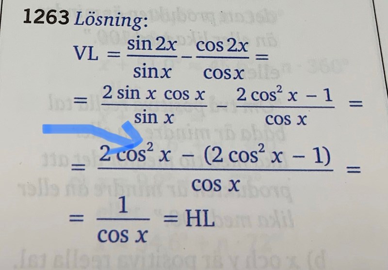 Steget innan förkortar man med en faktor sinx och då kvarstår 2cosx, förläng med cosx för att skriva på gemensamt bråkstreck.