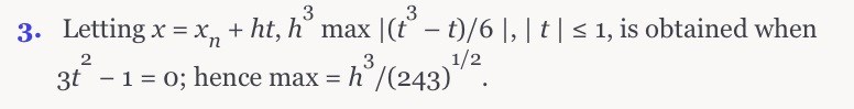 Genom att ersätta x med xn+ht i det ordinare uttrycket (VL) får man fram uttrycket h3max|(t3-t)/6|, så så långt är jag med, har även testat det själv och det stämmer. Men sedan förstår jag inte hur de kan få fram att t är mindre eller lika med 1 för 3t2-1=0? Det kan ju inte stämma, bör det inte bli t=1/(3)1/2?