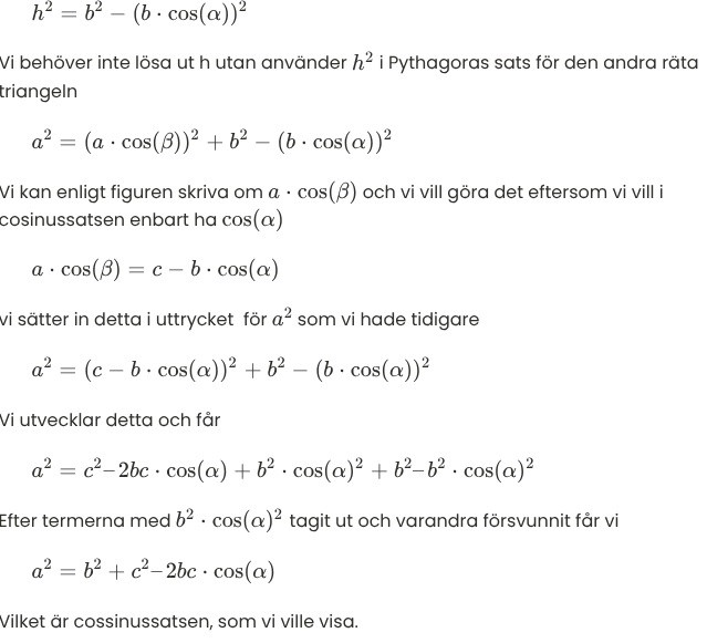 Vi kan enligt figuren skriva om a⋅cos(β) och vi vill göra det eftersom vi vill i cosinussatsen enbart ha cos(α)