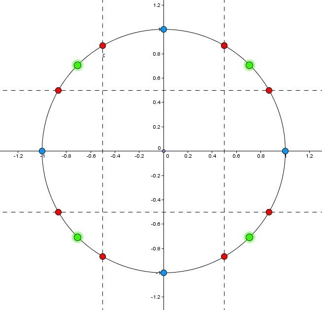 De vinklar man normalt förväntas kunna sin och cos av är 30, 45 och 60 grader, dvs de som finns i "en halv kvadrat" och "en halv liksidig triangel".