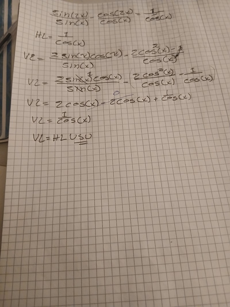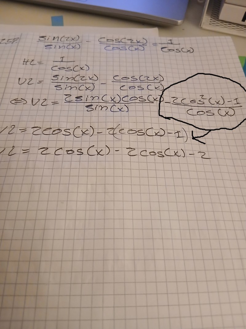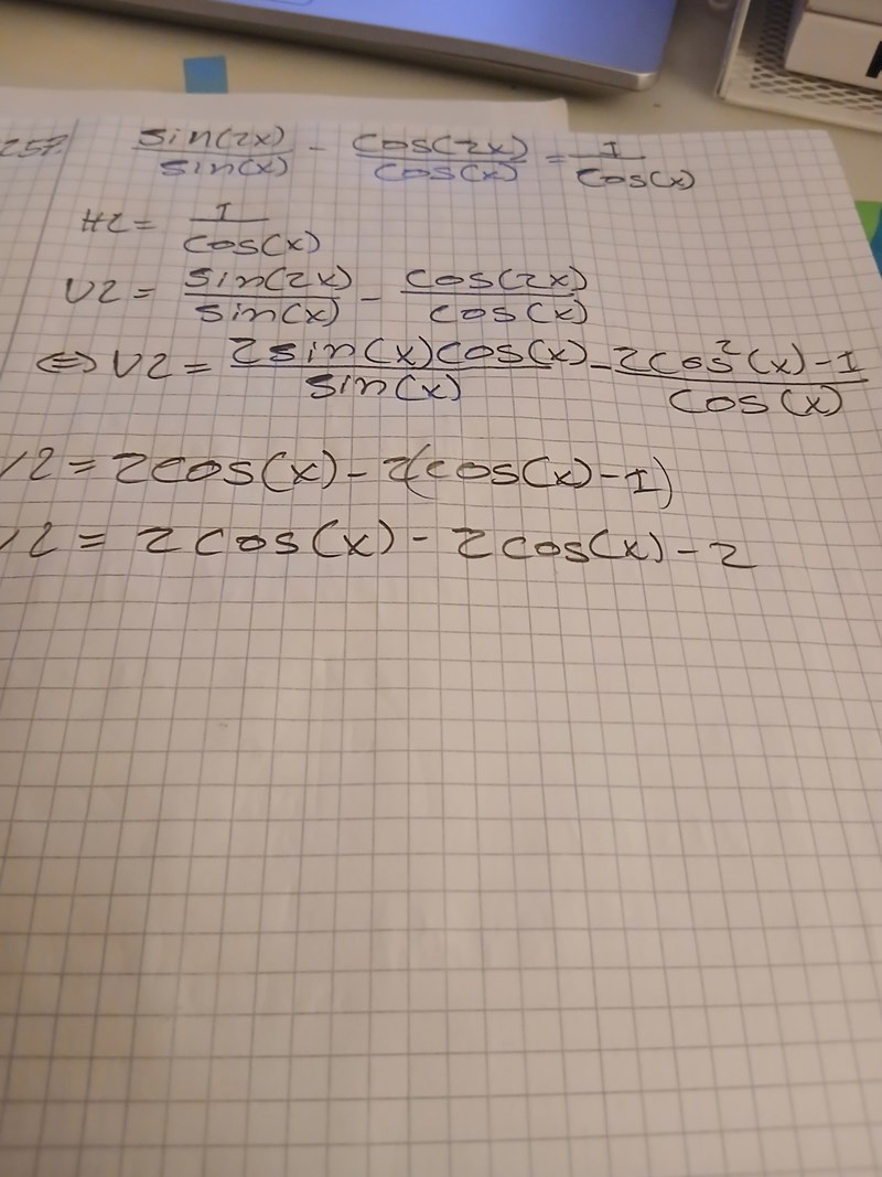 Det ser ut som att du i rad fyra till fem gl;mde att multiplicera in 1/cos(x) till 2cos(x)^2-1 s[ -att det blir -2(cos(x)^2)/x -(-1)/cos(x).