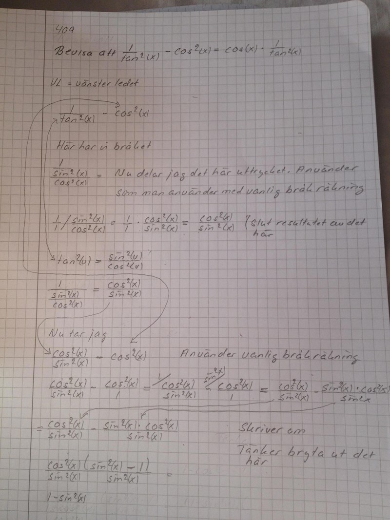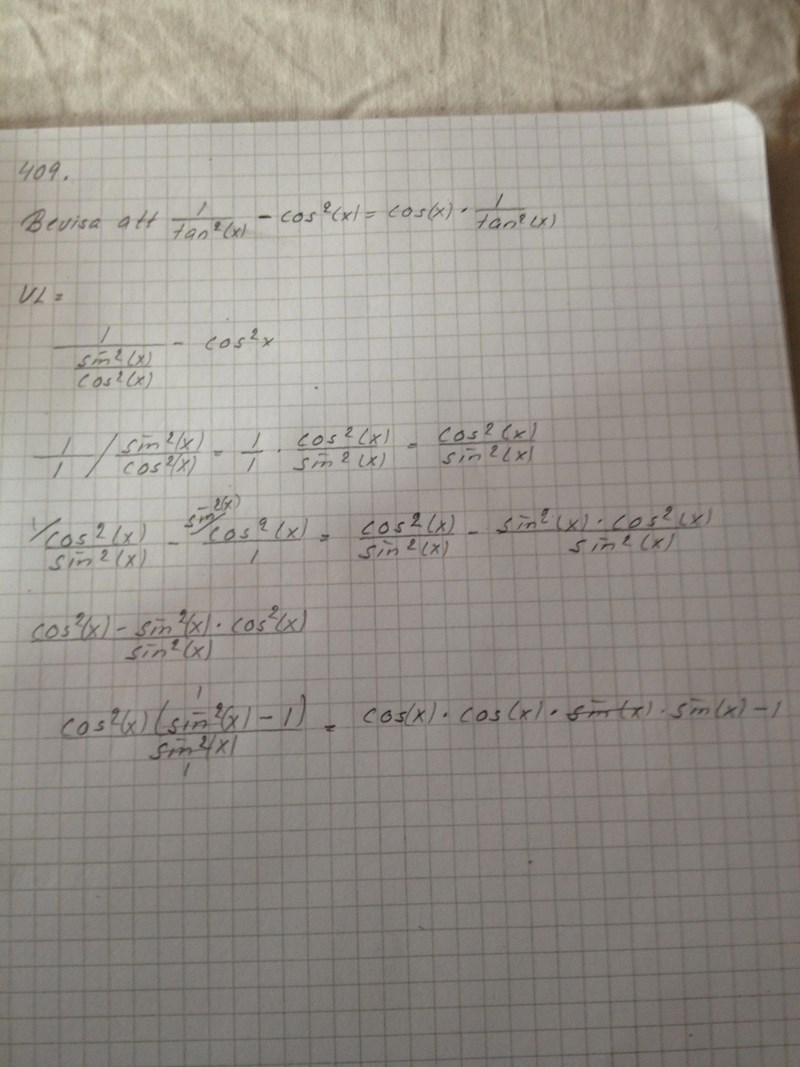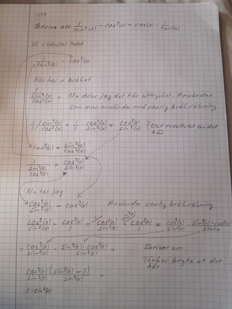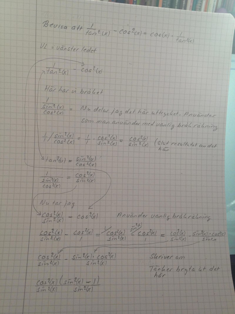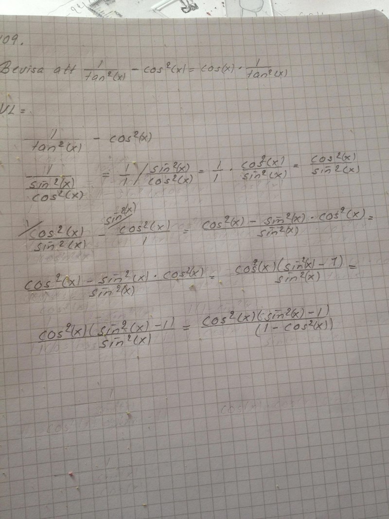 Först har du skrivit av VL - klokt och bra. Sedan, på nästa rad, tar du halva detta uttryck och gör något med det - alltså inte alls samma sak som på raden ovanför (men det finns inget likhetstecken i slutet på förra raden, så jag kanske inte borde räkna med det). Sedan hoppar du tillbaka till hela VL och har en egen beteckning för att du hörlänger med 1 resp sin^2(x), och nu har du likhetstecken mellan varje led.Du bryter ut cos^2(x) ur båda termerna - bra!
