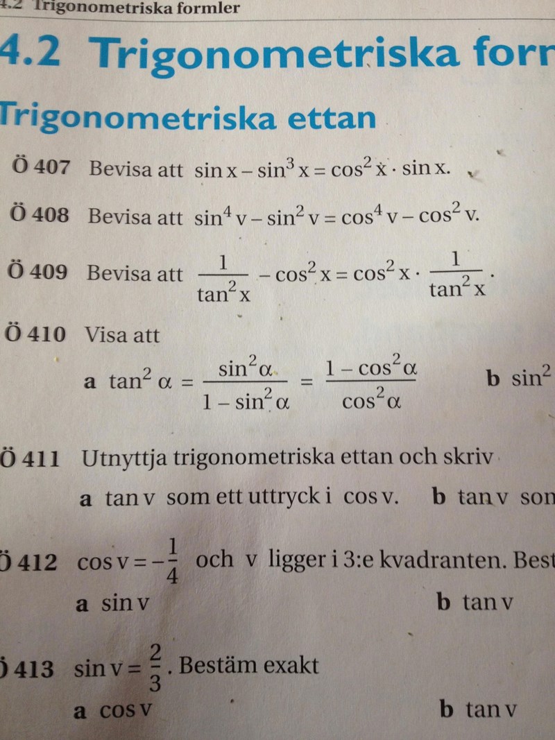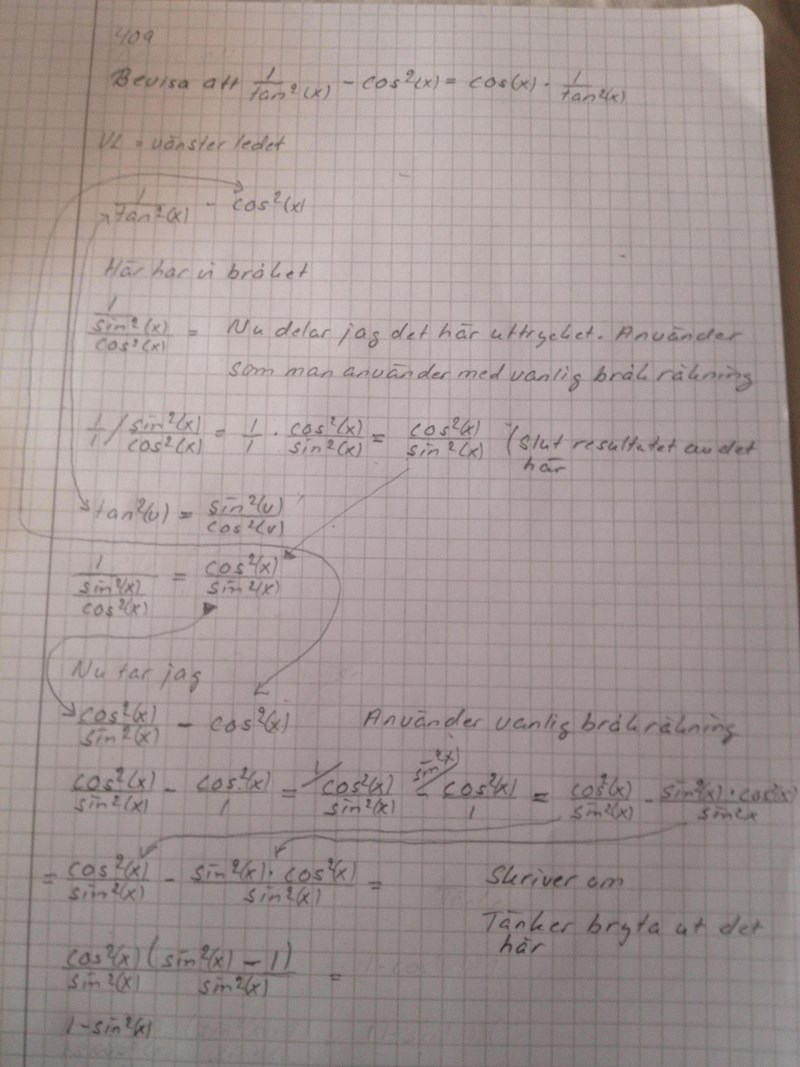 Det du skall göra nu är att använda trig.ettan på parentesen i täljaren på sista raden, inte på nämnaren. Sedan är du nästan framme.