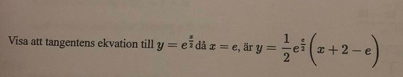 Tangenten går genom punkten och tangentens lutning ges av derivatan . Räta linjens ekvation på en-punktsform ger sambandet