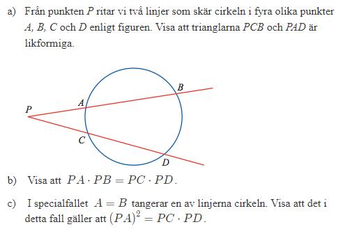 Tomten skrev:Utgå från det som du själv redan har bevisat i (b): PA*PB=PC*PD. I fig med den rätvinkliga triangeln sammanfaller A med B. Därför blir PA*PB=(PA) 2 = a2 och som jag skrev PC=c-b och PD=c+b Formeln PA*PB=PC*PD blir då a2=(c-b)(c+b)