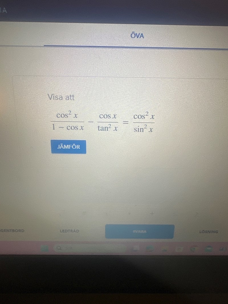 För x=0 är ingen av termerna definierad och för x=pi/2 är andra termen odefinierad. Påståendet att likheten gäller för alla x (vilket är underförstått när man inte skriver något) är således falskt. För övriga x kan man sätta t= cos x, sin2x blir då 1-t2 och tan2x = (1-t2)/t2 Likheten blir då t2/(1-t)-t3/(1-t2)=t2/(1-t2) Då t är nollskilt för dessa x-värden kan vi dividera alla termer med t2 och får då t/1-t)-t/(1-t2) = 1/(1-t2) Nu är det lätt att göra liknämnigt och få den önskade likheten.