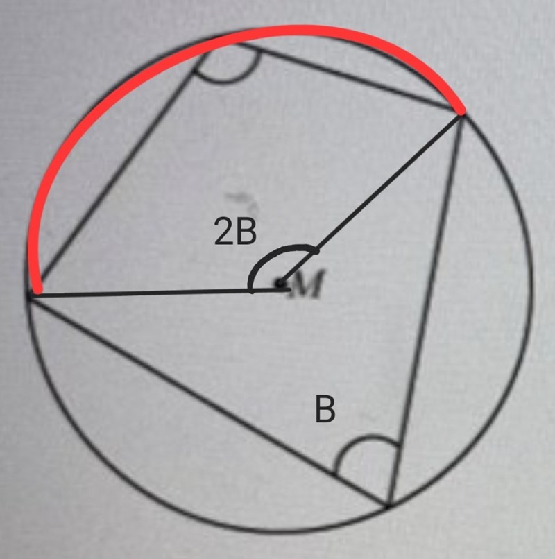 Jag tror jag förstår nu, man kan säg att mittpunkten blir: 2B+2A=360 (pga randvinkelsatsen) och att B+A=180, stämmer detta?
