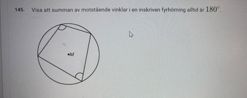 Drag radier från M till de två hörnen som ej har vinkelsymbol. Vilka centrumvinklar kan du nu märka ut, och hur stora är de? Vad kan du säga om deras summa?