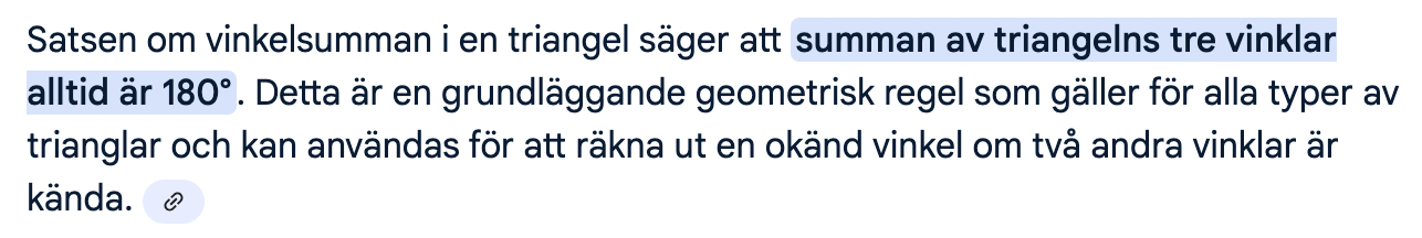 Louis skrev:Jag menade inte alldeles satslös, så det var väl slarvigt uttryckt. Men medan man säger "randvinkelsatsen" använder man mer sällan ordet sats för triangelns vinkelsumma. Även om det är en sats.